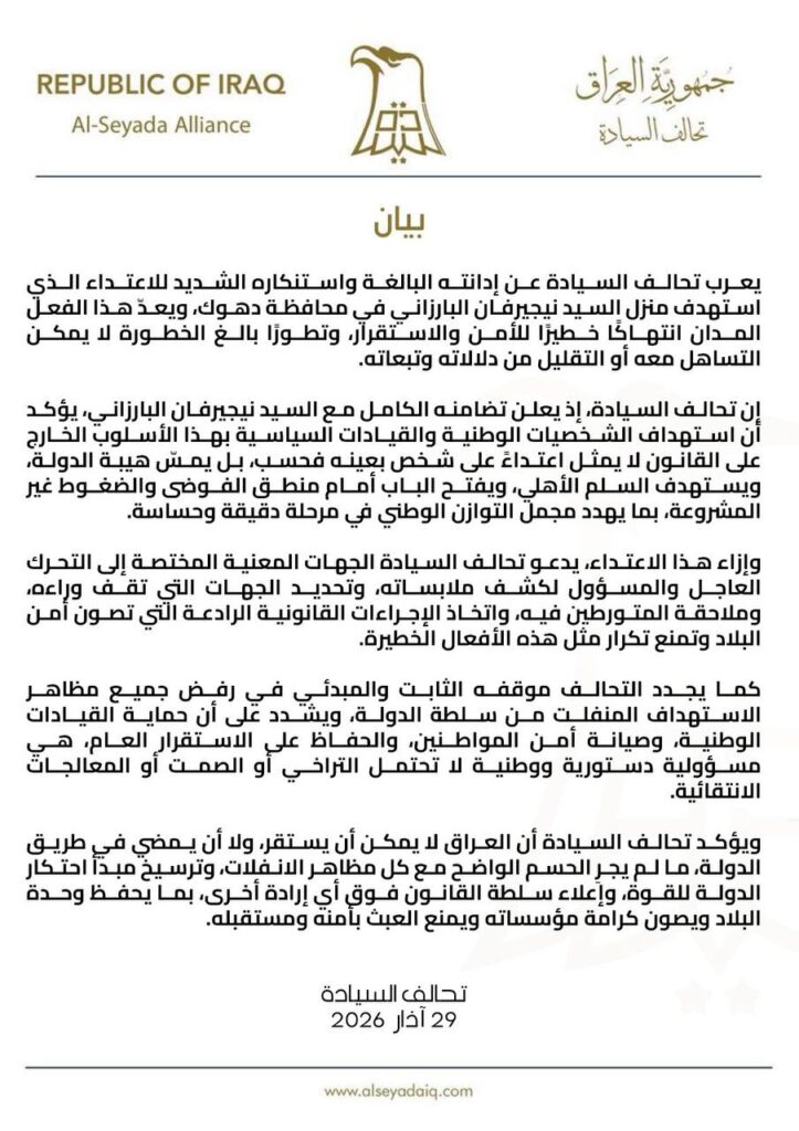 إن تحالف السيادة، إذ يعلن تضامنه الكامل مع السيد نيجيرفان البارزاني، يؤكد أن استهداف الشخصيات الوطنية والقيادات السياسية بهذا الأسلوب الخارج على القانون لا يمثل اعتداءً على شخص بعينه فحسب، بل يمسّ هيبة الدولة، ويستهدف السلم الأهلي، ويفتح الباب أمام منطق الفوضى والضغوط غير المشروعة، بما يهدد مجمل التوازن الوطني في مرحلة دقيقة وحساسة.